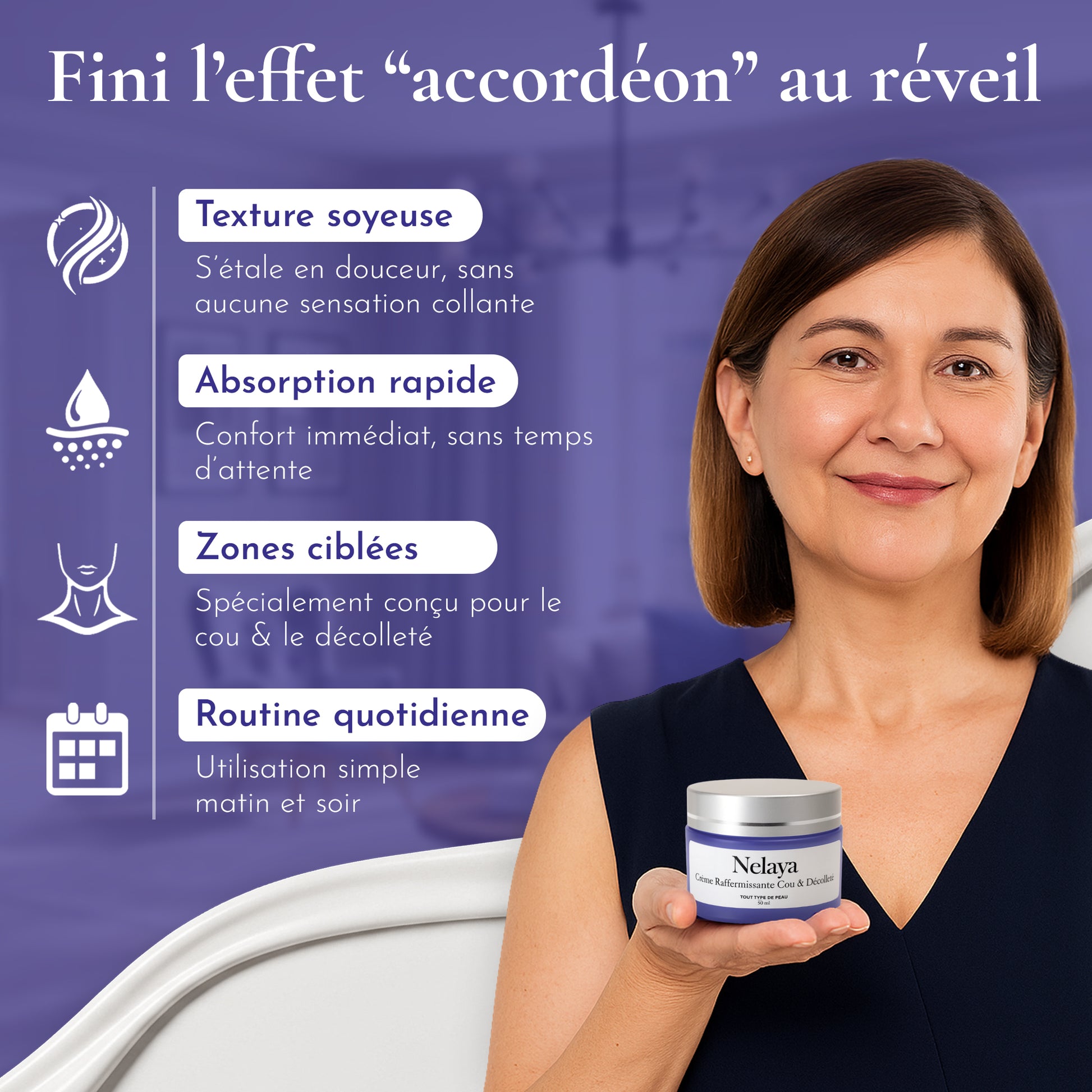 Matin et soir, appliquez une petite quantité sur le cou et le décolleté. Massez délicatement du bas vers le haut pour stimuler la fermeté et l'absorption des actifs.